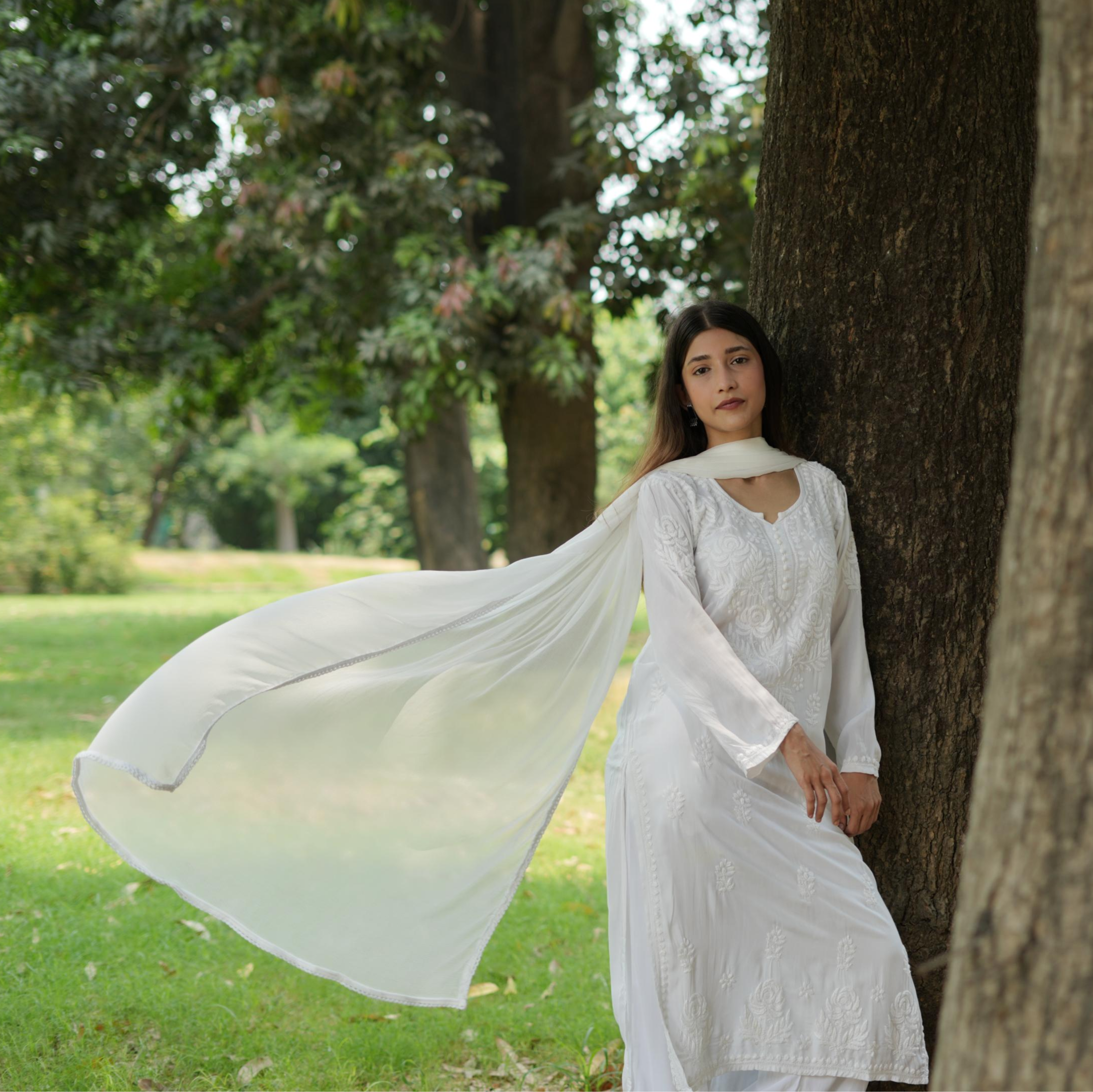 Chanderi White Chikankari Kurta Set – Hand-Embroidered Kurta and Pajama