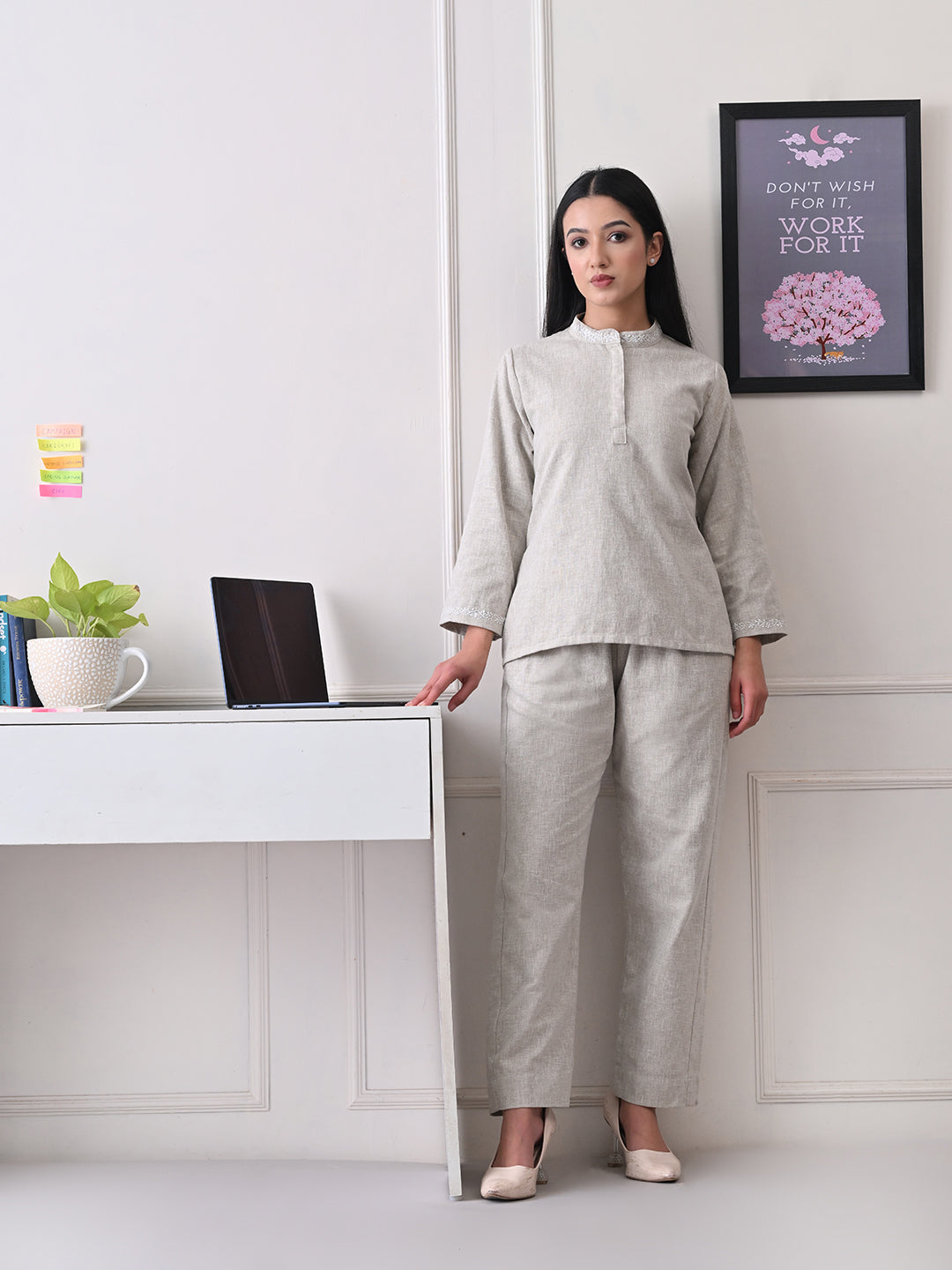Elevate your everyday office wardrobe with this understated beige chikankari co-ord set, crafted for all-day comfort and timeless minimalism. The straight-fit top features delicate hand embroidered chikankari work along the collar and sleeves, blending subtle heritage detail with modern tailoring.