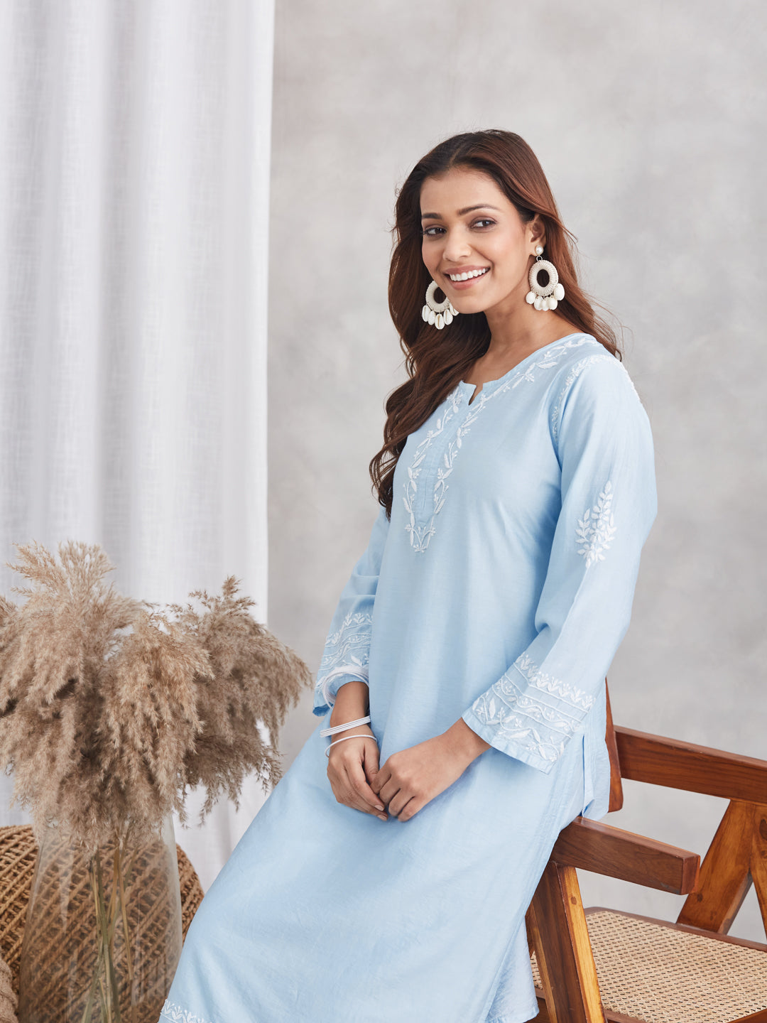 Step into refined elegance with this pastel blue chanderi chikankari kurta set, radiant blend of traditional artistry and contemporary finesse. The kurta features white chikankari floral embroidery along the scalloped hem,neck, sleeve cuffs, and matching pants creating eye-catching contrast on the lustrous, airy chanderi base. The straight-fit silhouette and three-quarter sleeves offer comfort throughout the day.