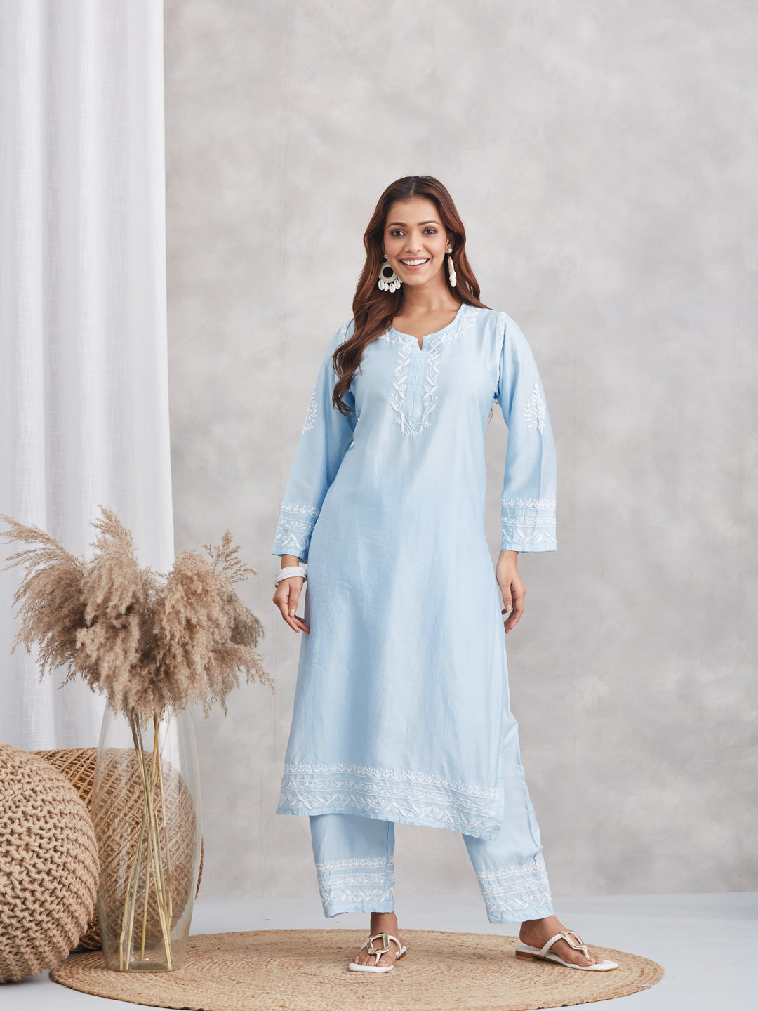 Embroidery: Handcrafted chikankari, leafy motifs at neck, cuffs, hem, and pant border