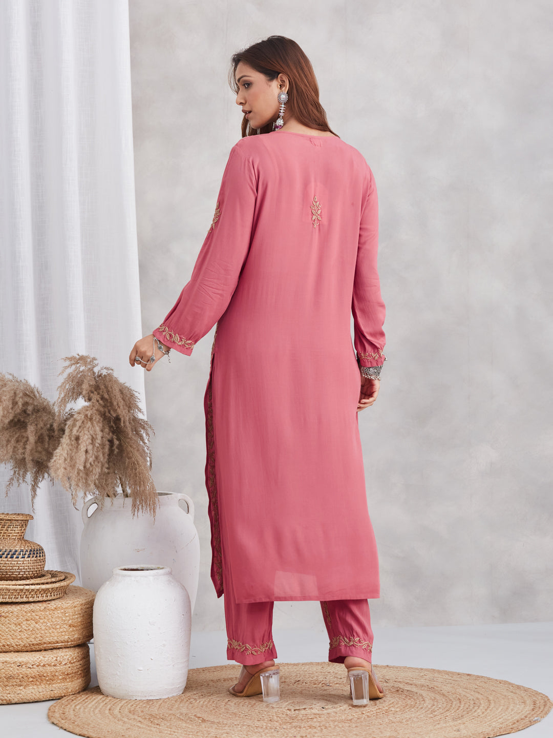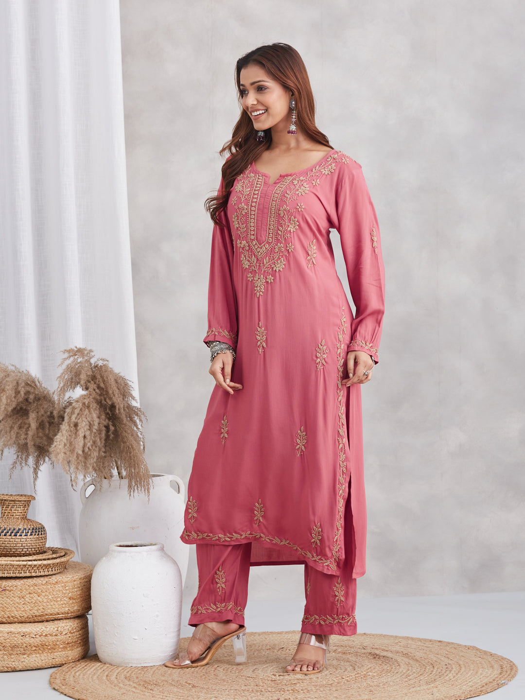 The modal-chikankari set pairs traditional artistry with subtle golden gloamour, a signature choice for statement-making simplicity and comfort